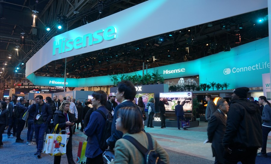 People visit the exhibition area of Chinese company Hisense at the 2024 Consumer Electronics Show (CES) in Las Vegas, the United States, Jan. 9, 2024. (Photo by Zeng Hui/Xinhua)