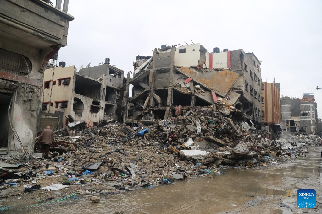 Photo taken on Jan. 11, 2024 shows damaged buildings in the northern Gaza Strip town of Beit Lahia. The Palestinian death toll from ongoing Israeli attacks on the Gaza Strip has risen to 23,469, the Gaza-based Health Ministry said on Thursday. (Photo by Abdul Rahman Salama/Xinhua)