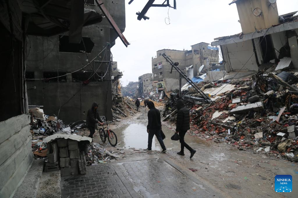 People walk past damaged buildings in the northern Gaza Strip town of Beit Lahia, on Jan. 11, 2024. The Palestinian death toll from ongoing Israeli attacks on the Gaza Strip has risen to 23,469, the Gaza-based Health Ministry said on Thursday. (Photo by Abdul Rahman Salama/Xinhua)