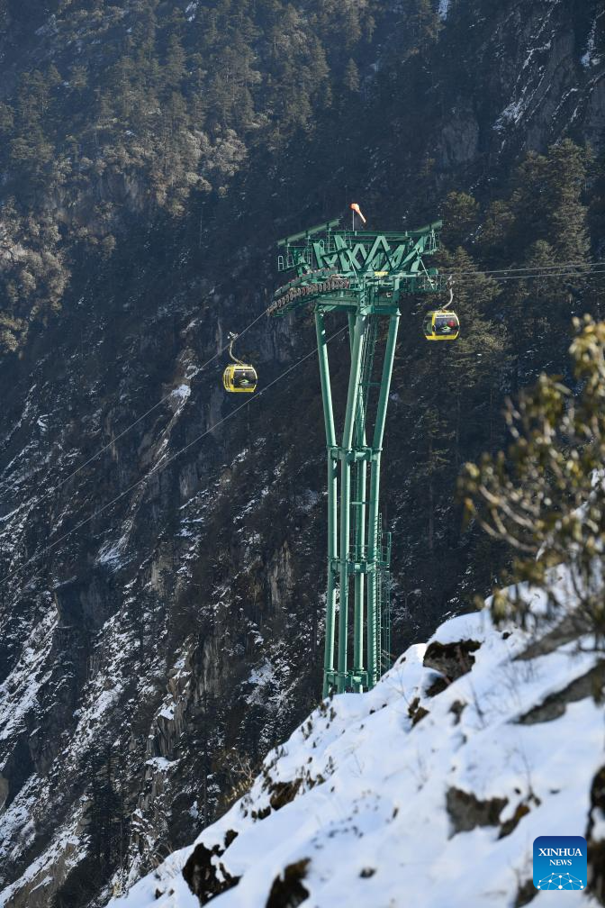 Cable cars are pictured at Hailuogou scenic area in Garze Tibetan Autonomous Prefecture, southwest China's Sichuan Province, Jan. 10, 2024. Hailuogou scenic area reopened to visitors on Dec. 12, 2023 with newly-built and upgraded infrastructure, over a year after a 6.8-magnitude earthquake forced its closure. (Xinhua/Xu Bingjie)