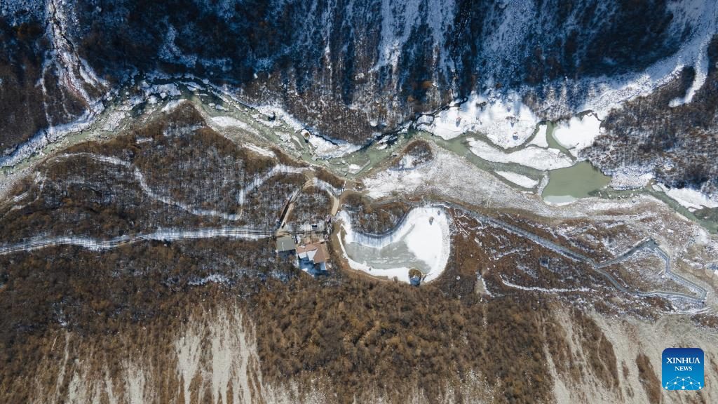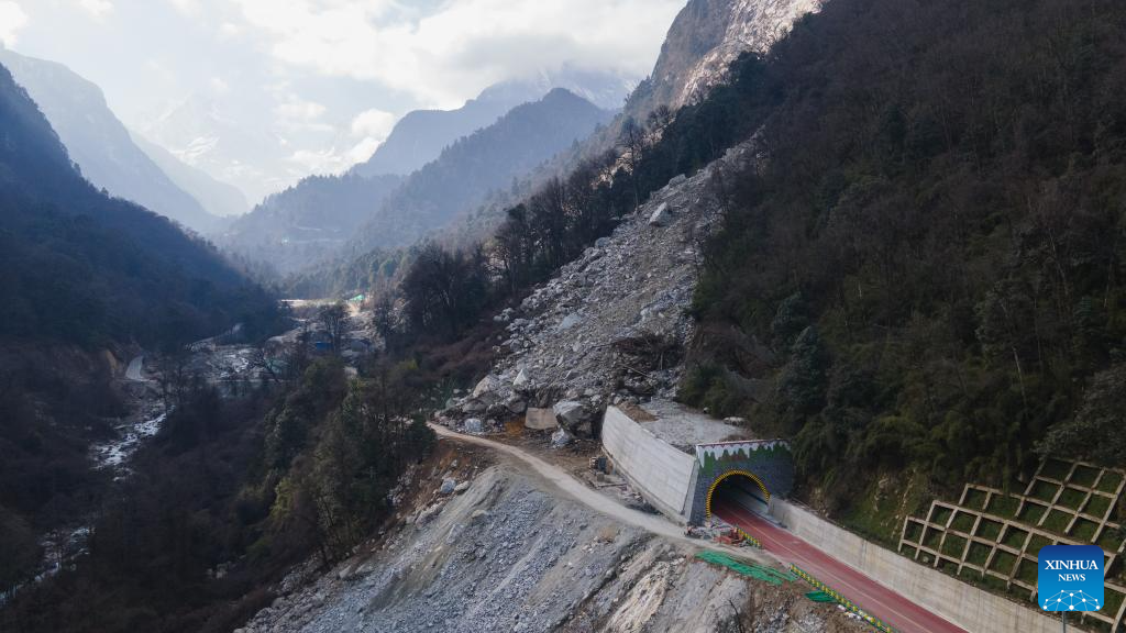 A drone photo taken on Jan. 10, 2024 shows a newly-built tunnel at Hailuogou scenic area in Garze Tibetan Autonomous Prefecture, southwest China's Sichuan Province. Hailuogou scenic area reopened to visitors on Dec. 12, 2023 with newly-built and upgraded infrastructure, over a year after a 6.8-magnitude earthquake forced its closure. (Xinhua/Xu Bingjie)