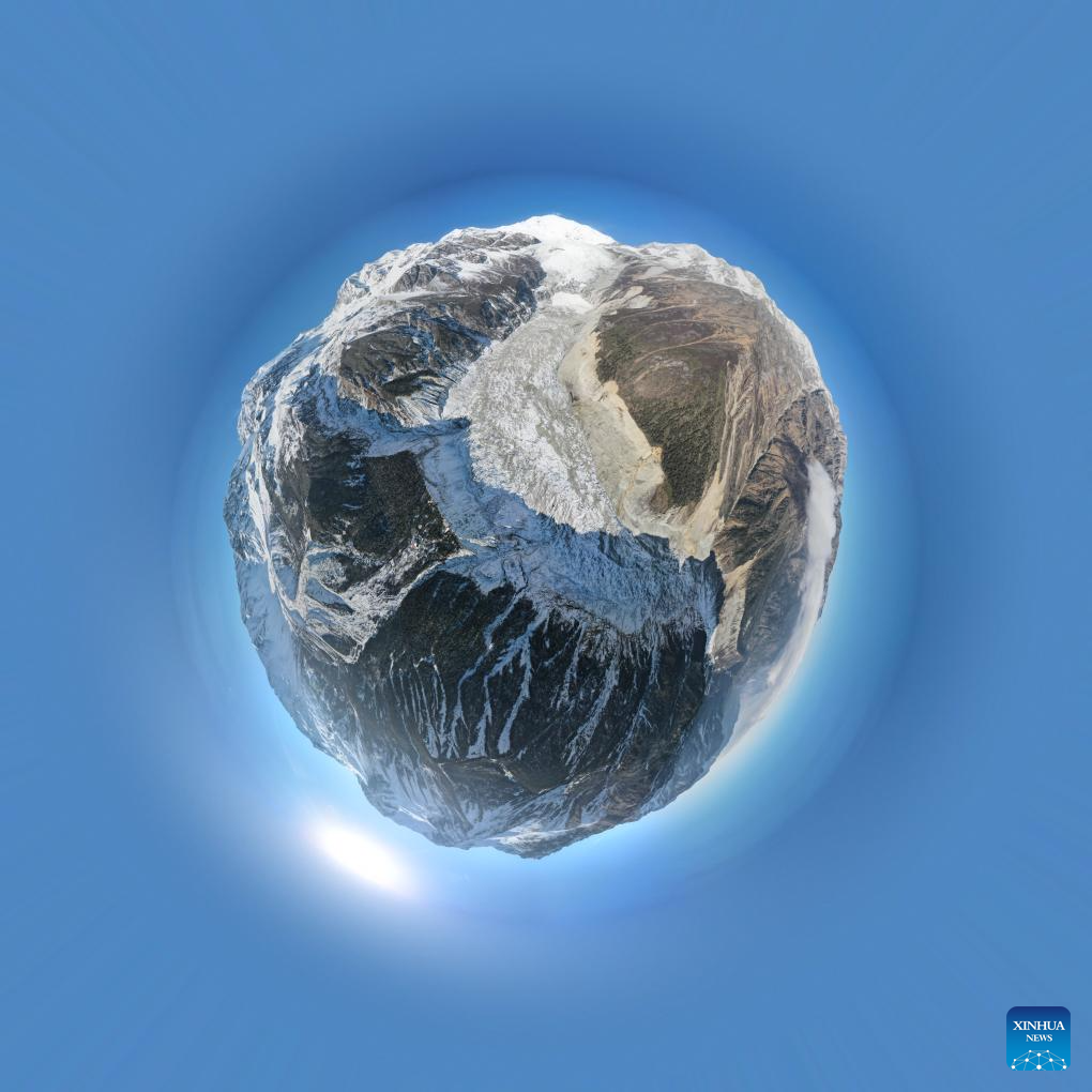 An aerial panoramic drone photo taken on Jan. 10, 2024 shows a view of the glacier at Hailuogou scenic area in Garze Tibetan Autonomous Prefecture, southwest China's Sichuan Province. Hailuogou scenic area reopened to visitors on Dec. 12, 2023 with newly-built and upgraded infrastructure, over a year after a 6.8-magnitude earthquake forced its closure. (Xinhua/Xu Bingjie)