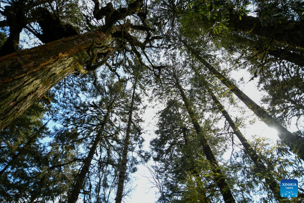 This photo taken on Jan. 10, 2024 shows trees at Hailuogou scenic area in Garze Tibetan Autonomous Prefecture, southwest China's Sichuan Province. Hailuogou scenic area reopened to visitors on Dec. 12, 2023 with newly-built and upgraded infrastructure, over a year after a 6.8-magnitude earthquake forced its closure. (Xinhua/Xu Bingjie)