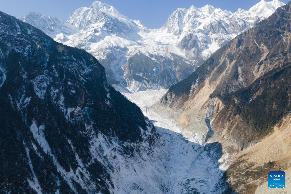 A drone photo taken on Jan. 10, 2024 shows a view of the glacier at Hailuogou scenic area in Garze Tibetan Autonomous Prefecture, southwest China's Sichuan Province. Hailuogou scenic area reopened to visitors on Dec. 12, 2023 with newly-built and upgraded infrastructure, over a year after a 6.8-magnitude earthquake forced its closure. (Xinhua/Xu Bingjie)
