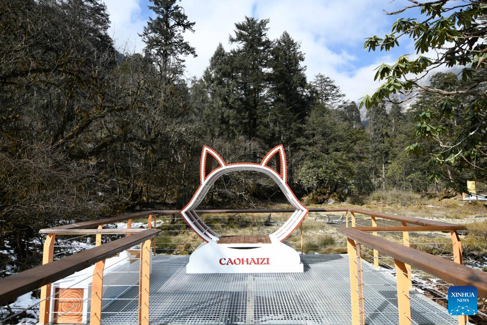This photo taken on Jan. 10, 2024 shows an animal-shaped installation for visitors to take photos on a path at Hailuogou scenic area in Garze Tibetan Autonomous Prefecture, southwest China's Sichuan Province. Hailuogou scenic area reopened to visitors on Dec. 12, 2023 with newly-built and upgraded infrastructure, over a year after a 6.8-magnitude earthquake forced its closure. (Xinhua/Xu Bingjie)