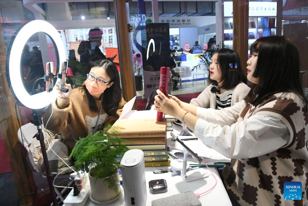 A staff member introduces a book via live streaming at 2024 Beijing Book Fair in Beijing, capital of China, Jan. 11, 2024. More than 720 exhibitors participated in the 2024 Beijing Book Fair which started on Thursday, showcasing more than 400,000 kinds of books. (Xinhua/Ju Huanzong)