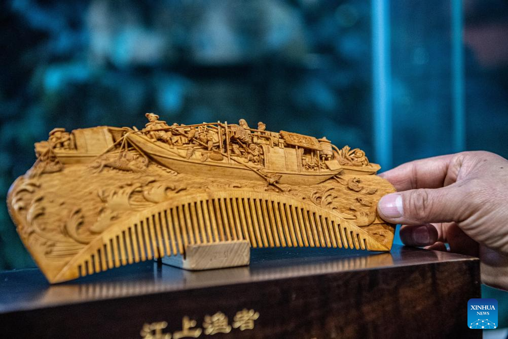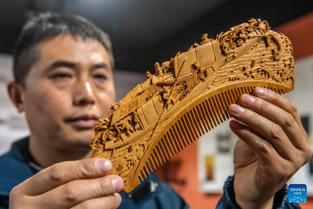 Yu Dahong, a representative inheritor of the art, set out on wood carving in 1989 when he was 13 years old. Having engaged in the art for over 30 years, he has made numerous comb artworks that earned him various medals at the national and provincial levels. Focusing on the research, preserving and innovation of the crafts, he puts his heart and soul into passing on his experiences to the apprentices nowadays. "As an inheritor, I have the responsibility of passing down the crafts," said Yu.