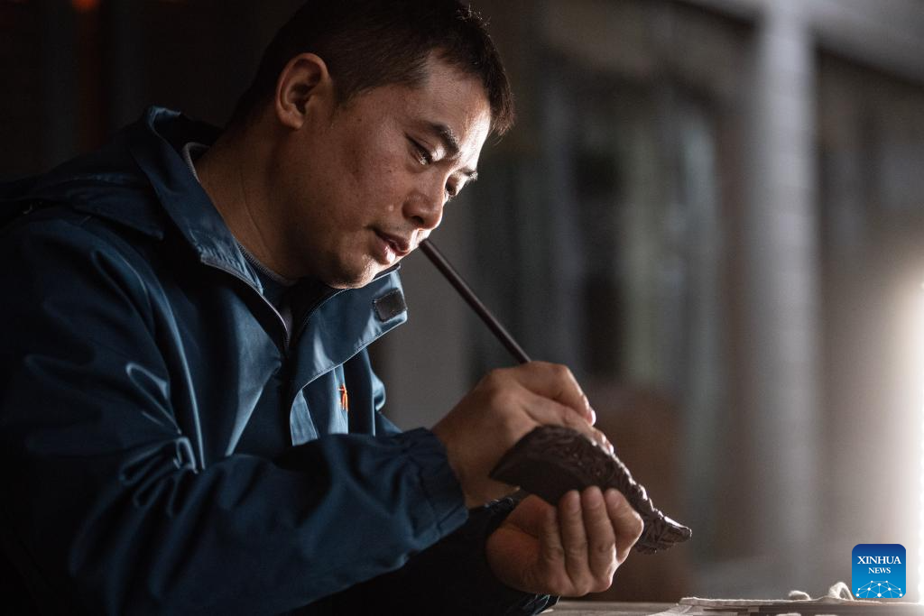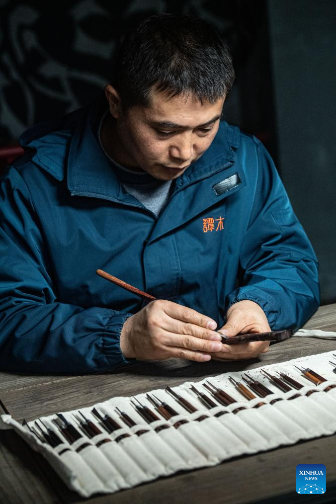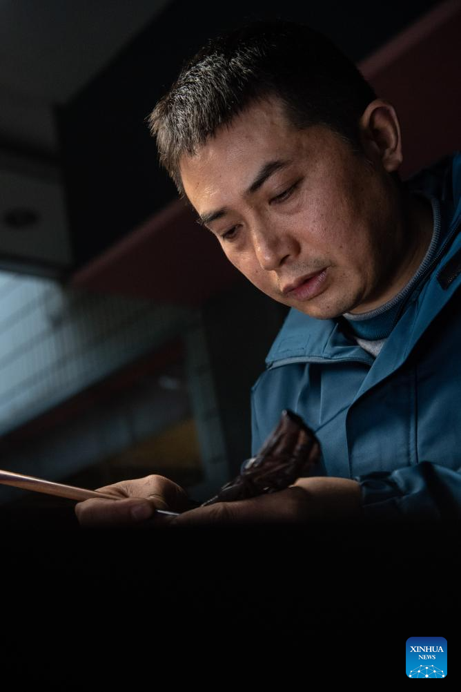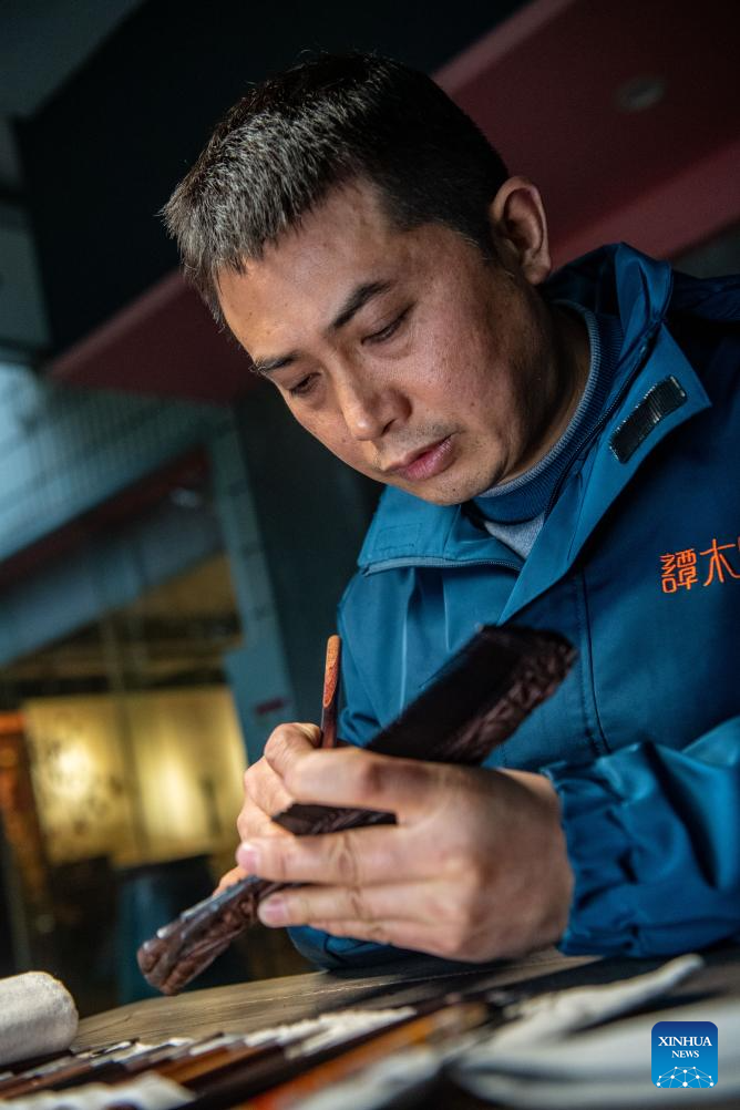 Yu Dahong engraves on a wooden comb at a workshop of Tanmujiang factory in Chongqing, southwest China, Jan. 5, 2024.(Xinhua/Tang Yi)