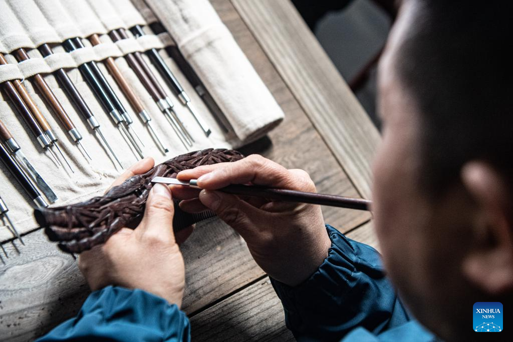 Pic story: inheritor of Tanmujiang wooden comb carving craft