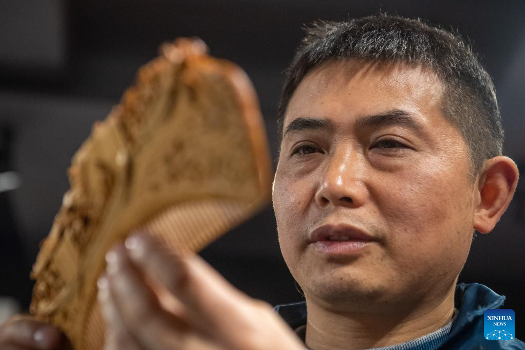 Yu Dahong looks at a wooden comb he engraved at a workshop of Tanmujiang factory in Chongqing, southwest China, Jan. 5, 2024.(Xinhua/Tang Yi)