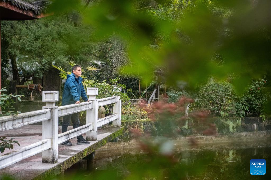Yu Dahong seeks inspiration by lakeside near the Tanmujiang factory in Chongqing, southwest China, Jan. 5, 2024.(Xinhua/Tang Yi)