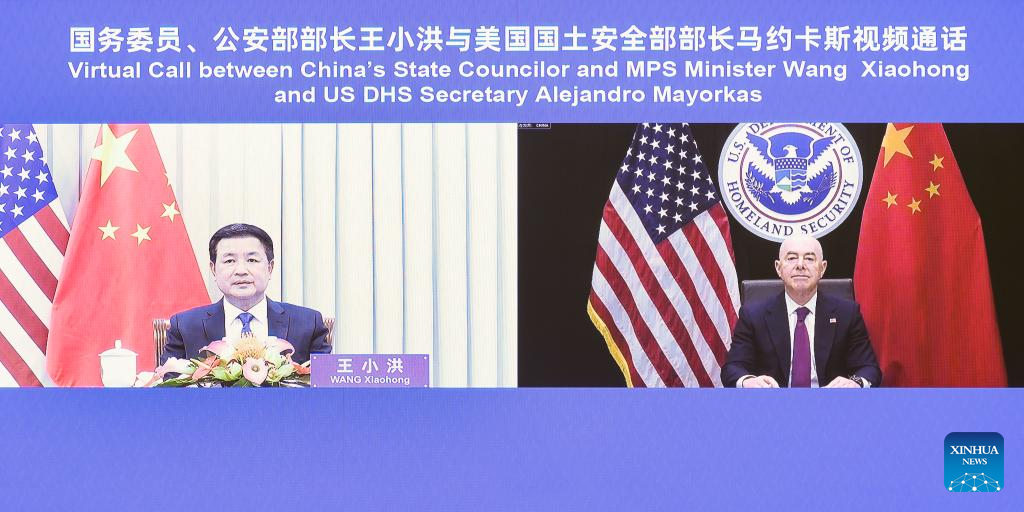 BEIJING, Jan. 11 (Xinhua) -- Chinese State Councilor and Minister of Public Security Wang Xiaohong met with U.S. Department of Homeland Security Secretary Alejandro Mayorkas via video link on Wednesday.