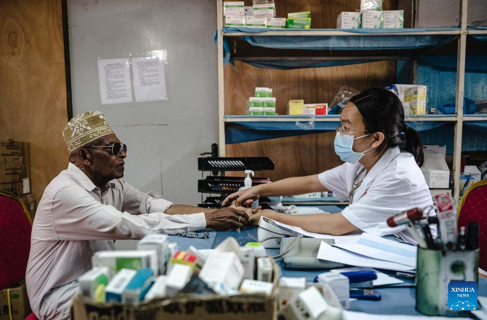 Xu Rongting, a member of the Chinese medical team, examines a patient at the El-Maarouf Hospital in Moroni, capital of the Comoros, Jan. 11, 2024. The medical team from south China's Guangxi Zhuang Autonomous Region arrived in the Comoros in 2022, providing medical services for local patients and training for local doctors. (Xinhua/Wang Guansen)