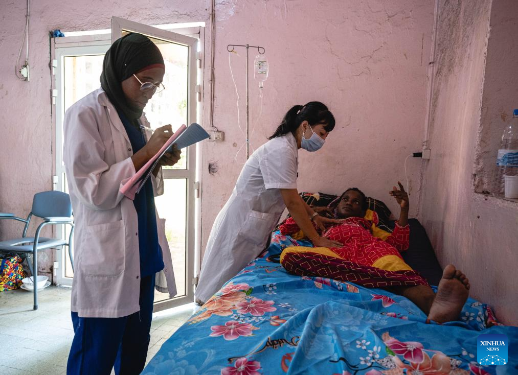 Pan Chunxi, head of the Chinese medical team to the Comoros, examines a patient at the El-Maarouf Hospital in Moroni, capital of the Comoros, Jan. 11, 2024. The medical team from south China's Guangxi Zhuang Autonomous Region arrived in the Comoros in 2022, providing medical services for local patients and training for local doctors. (Xinhua/Wang Guansen)