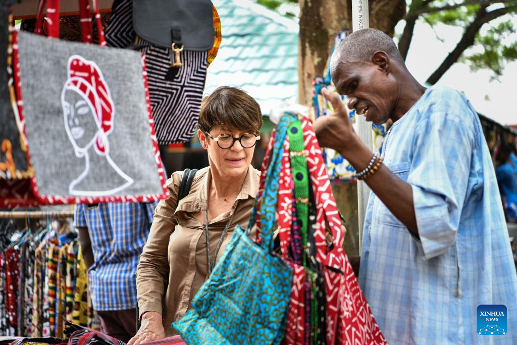 A customer shops at a handicraft market in Abidjan, Cote d'Ivoire, on Jan. 12, 2024. (Xinhua/Han Xu)