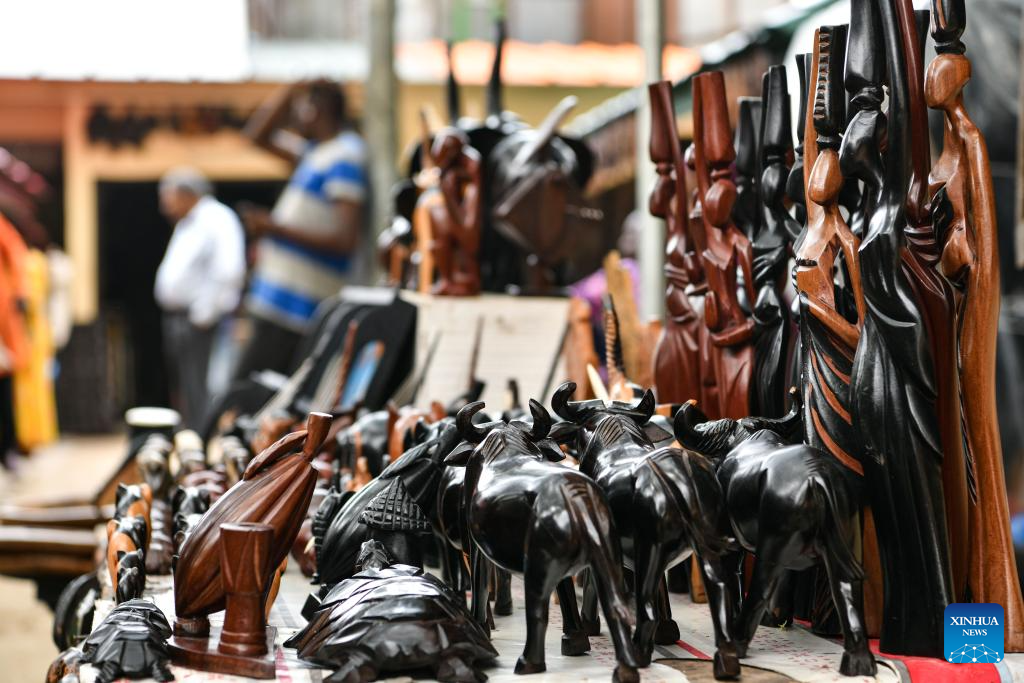 This photo taken on Jan. 12, 2024 shows artworks at a handicraft market in Abidjan, Cote d'Ivoire. (Xinhua/Han Xu)