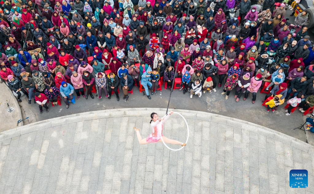 An aerial drone photo taken on Jan. 14, 2024 shows an acrobat performing in Yazhou Town, Haian of east China's Jiangsu Province. (Photo by Zhai Huiyong/Xinhua)