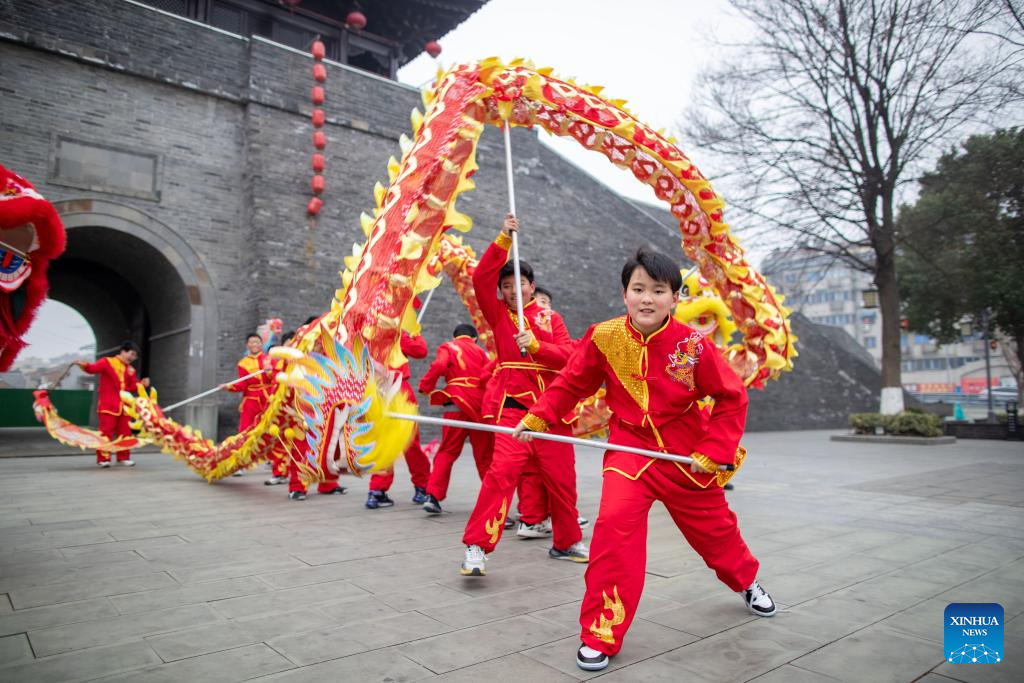 Students practice dragon dance in Xinghua of east China's Jiangsu Province, Jan. 14, 2024. (Photo by Zhou Shegen/Xinhua)