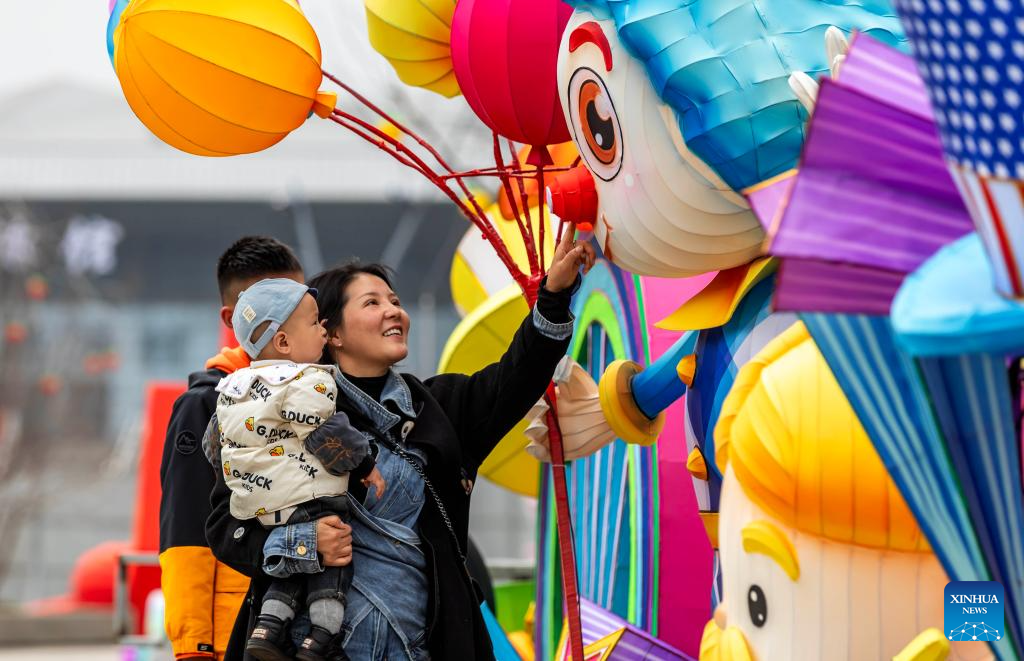 Citizens look at lanterns at a sports center in Qianxi City, southwest China's Guizhou Province, Jan. 14, 2024. (Photo by Fan Hui/Xinhua)
