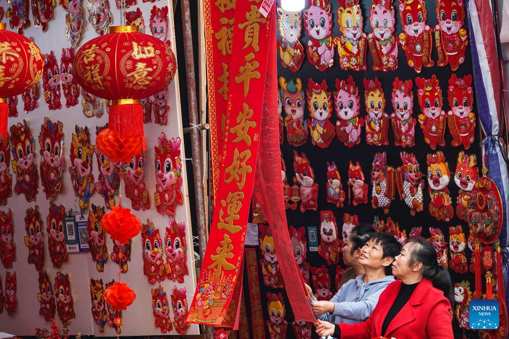 Citizens buy couplets at a market in Nanning, south China's Guangxi Zhuang Autonomous Region, Jan. 14, 2024. (Photo by Yu Xiangquan/Xinhua)