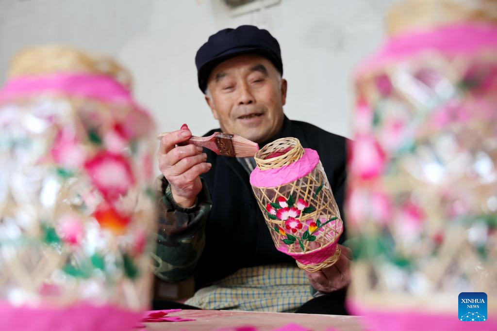 A craftsman makes a lantern in Binzhou, east China's Shandong Province, Jan. 14, 2023. (Photo by Chu Baorui/Xinhua)