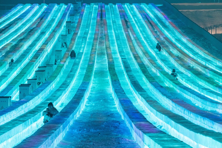 Tourists enjoy rides on an ice slide at Harbin Ice-Snow World in Harbin, northeast China's Heilongjiang Province, Jan. 2, 2024. (Xinhua/Xie Jianfei)