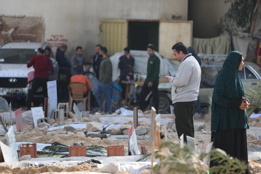 People mourn dead Palestinians at the graves in Al-Shifa Hospital in Gaza City, Dec. 31, 2023. (Photo by Mohammed Ali/Xinhua)
