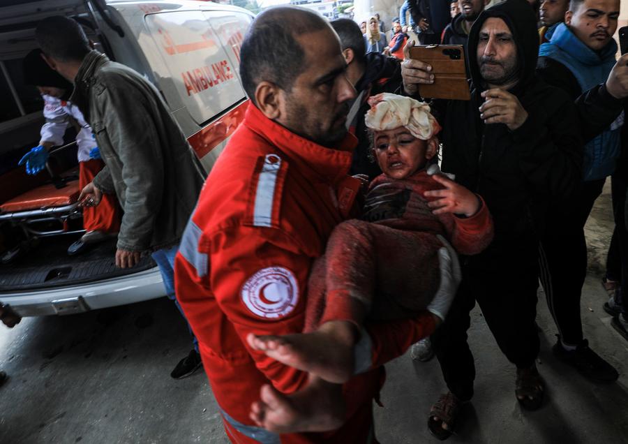 An injured girl is transferred to a hospital in the southern Gaza Strip city of Khan Younis, on Jan. 12, 2024. (Photo by Yasser Qudih/Xinhua)
