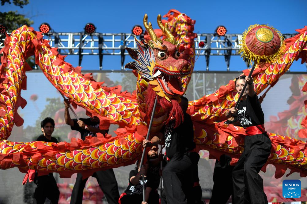 Performers play a dragon dance during an event to greet the upcoming Spring Festival in Santiago, Chile, Jan. 13, 2024. (Photo by Jorge Villegas/Xinhua)