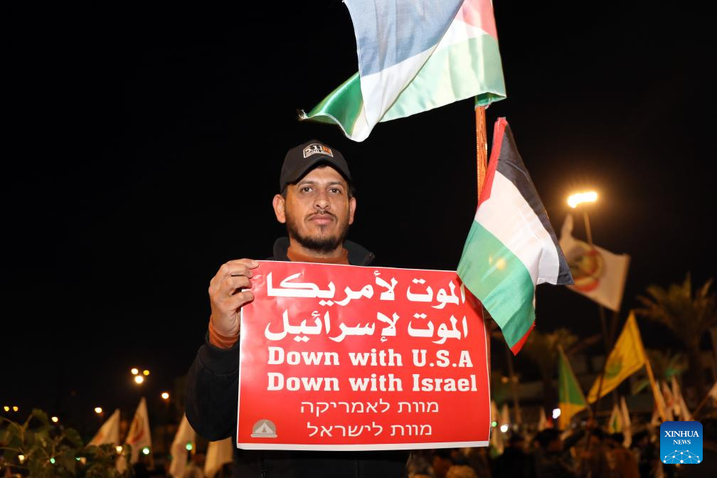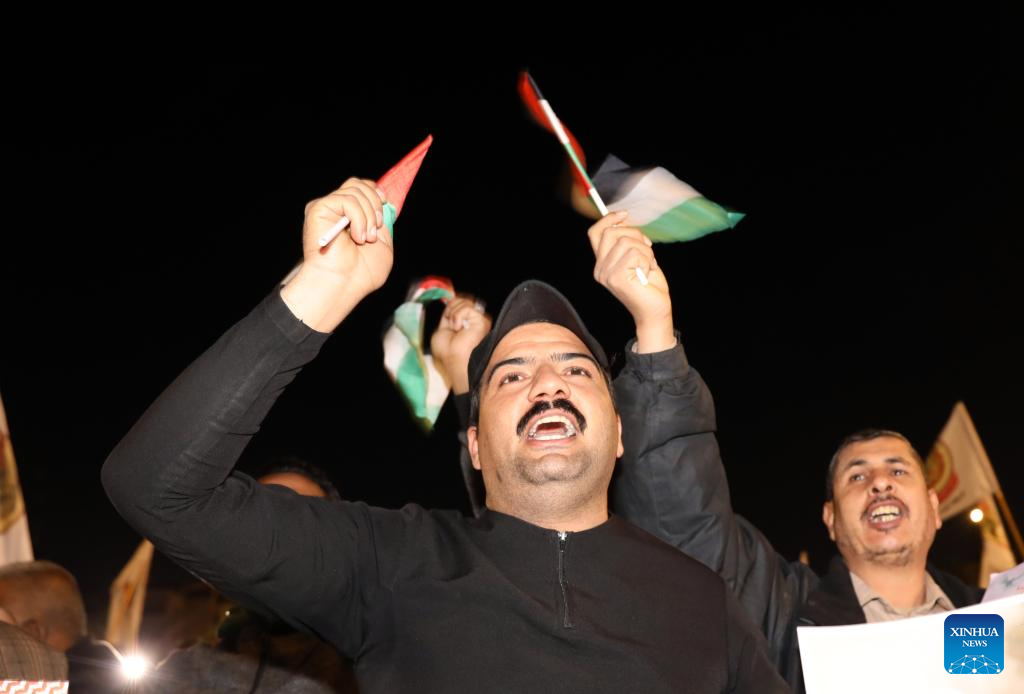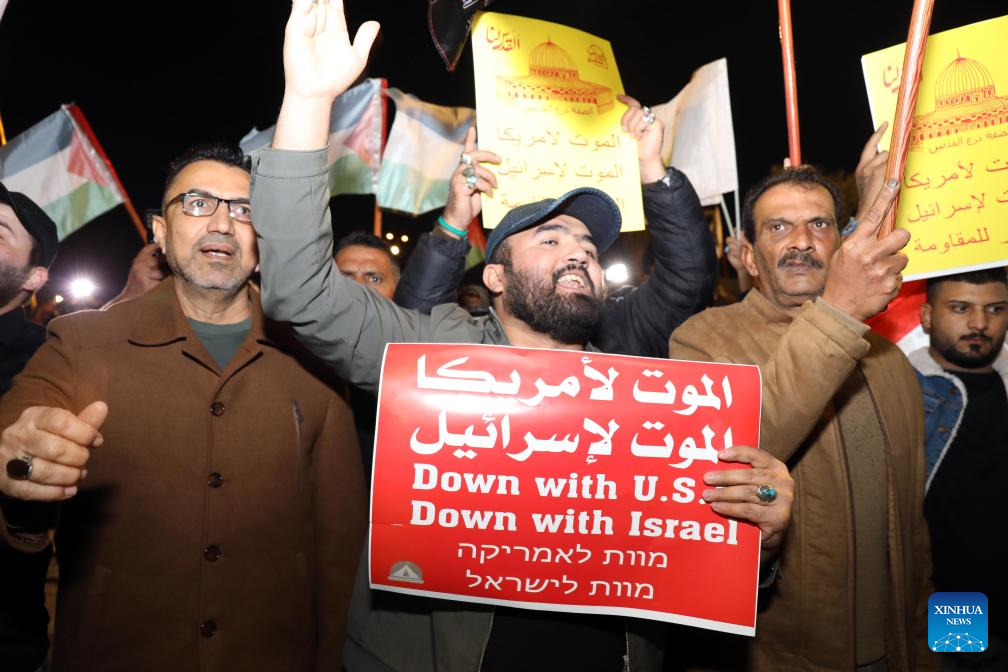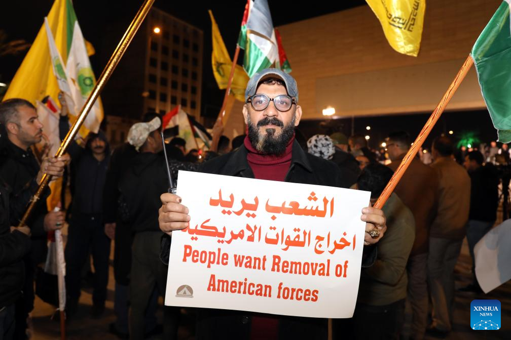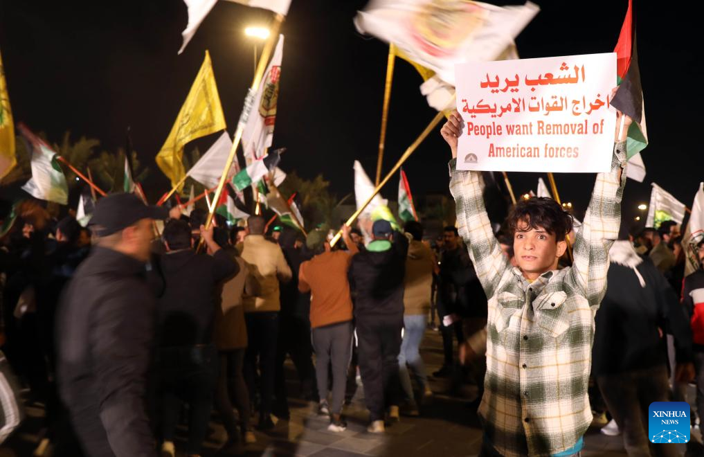 BAGHDAD, Jan. 13 (Xinhua) -- Hundreds of Iraqis held a rally on Saturday in Iraq's capital Baghdad in protest against the U.S.-Britain strikes against some Houthi military sites in Yemen.
