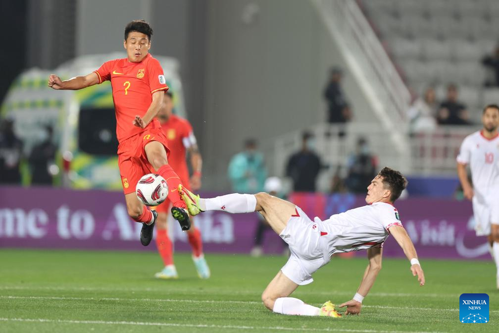 Liu Yang (L) of China vies with Kamolov Amadoni of Tajikistan during the Group A match between China and Tajikistan of AFC Asian Cup at Abdullah bin Khalifa Stadium in Doha, Qatar, on Jan. 13, 2024. (Xinhua/Jiang Han)