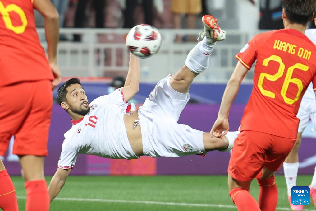 Zhu Chenjie (Top) of China scores a goal which is later disallowed due to offside during the Group A match between China and Tajikistan at AFC Asian Cup in Doha, Qatar, on Jan. 13, 2024. (Xinhua/Cao Can)