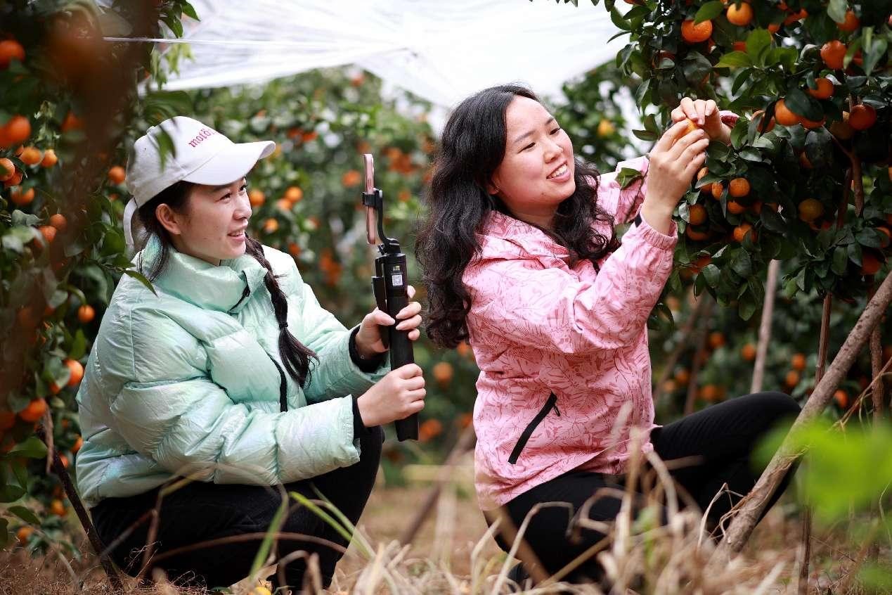 Photo taken on Jan. 5, 2024 shows livestreamers promoting mandarin oranges online in an orchard in Shuangjiang township, Tongdao Dong autonomous county, central China's Hunan province. (People's Daily Online/Li Shangyin)