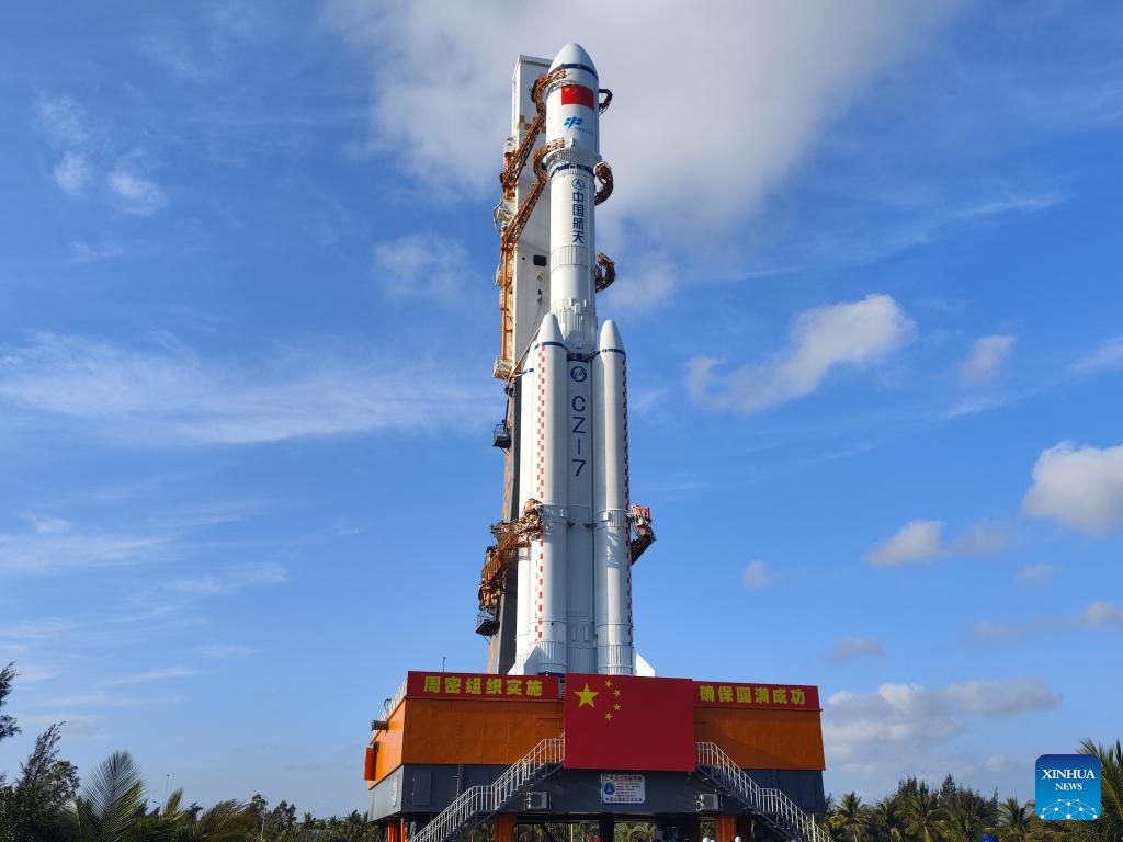 WENCHANG, Hainan, Jan. 15 (Xinhua) -- The combination of the Tianzhou-7 cargo spacecraft and a Long March-7 Y8 carrier rocket was vertically transferred to the launching area on Monday.