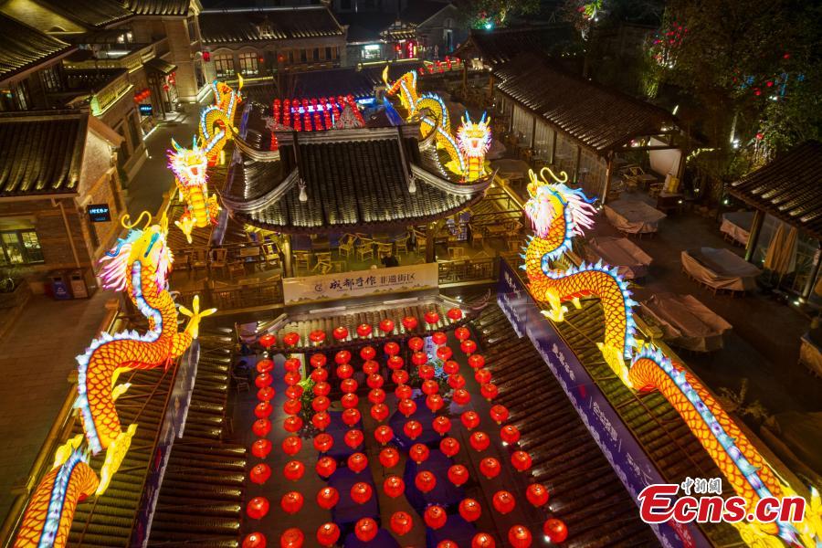 Four sets of Loong-themed lanterns shine over roof top of Dongmen street in Chengdu, southwest China's Sichuan Province, Jan. 13, 2024. (Photo: China News Service/Zhang Lang)