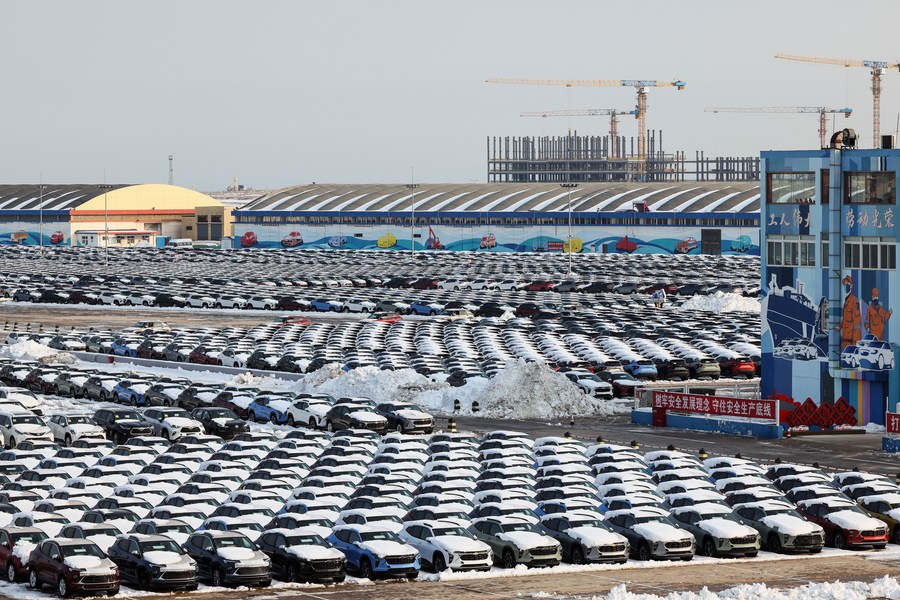 This photo taken on Dec. 27, 2023 shows vehicles to be loaded for export at Yantai Port in east China's Shangdong Province. (Xinhua/Lan Hongguang)