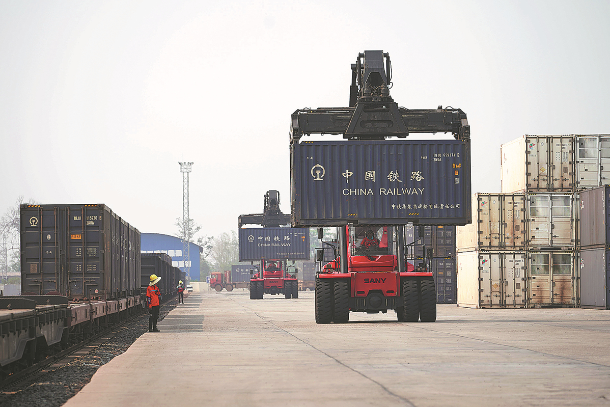 Goods are loaded at Vientiane station on the China-Laos Railway in April. [XING GUANGLI/XINHUA]