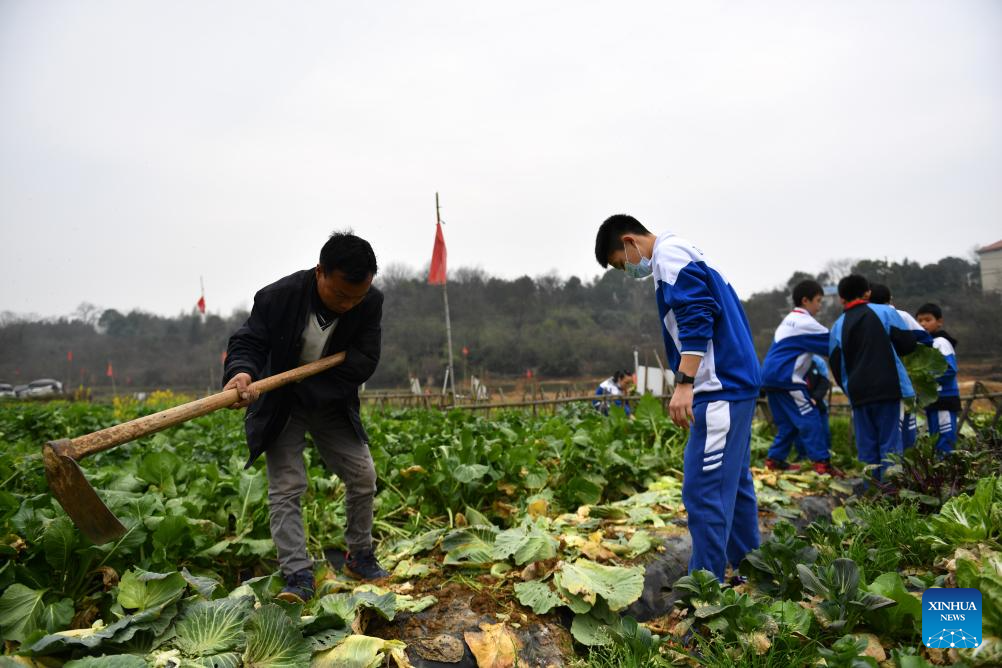 Liu Shaowen (1st L), a member of the Shangshan Service Center for the Disabled, leads students from a middle school of Changsha in a farming experiences activity in Lianhuashan Village, Yuelu District of Changsha, central China's Hunan Province, March 4, 2022. (Xinhua/Chen Zhenhai)
