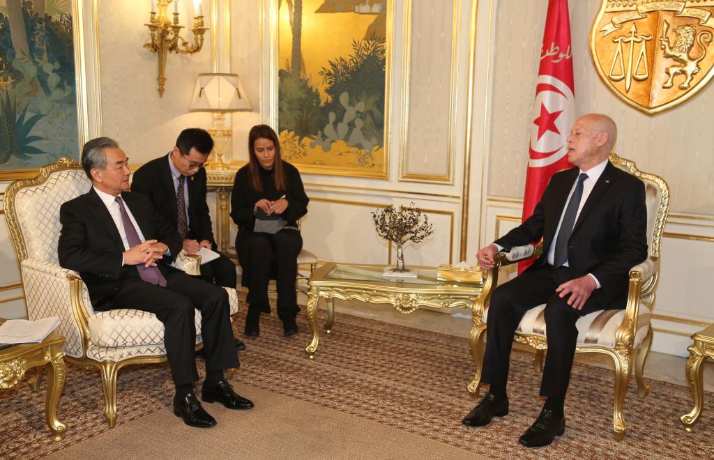 Tunisian President Kais Saied (1st R) meets with visiting Chinese Foreign Minister Wang Yi (1st L), also a member of the Political Bureau of the Communist Party of China Central Committee, in Tunis, Tunisia, Jan. 15, 2024. (Xinhua/Huang Ling)