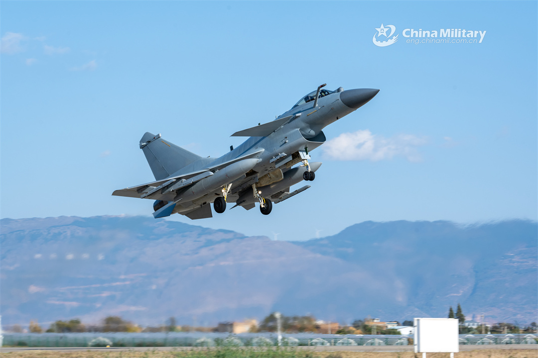 A J-10 fighter jet attached to an aviation brigade with the air force under PLA Southern Theater Command takes off with speed during a flight training exercise on December 25, 2023. (eng.chinamil.com.cn/Photo by Shang Jieyan)