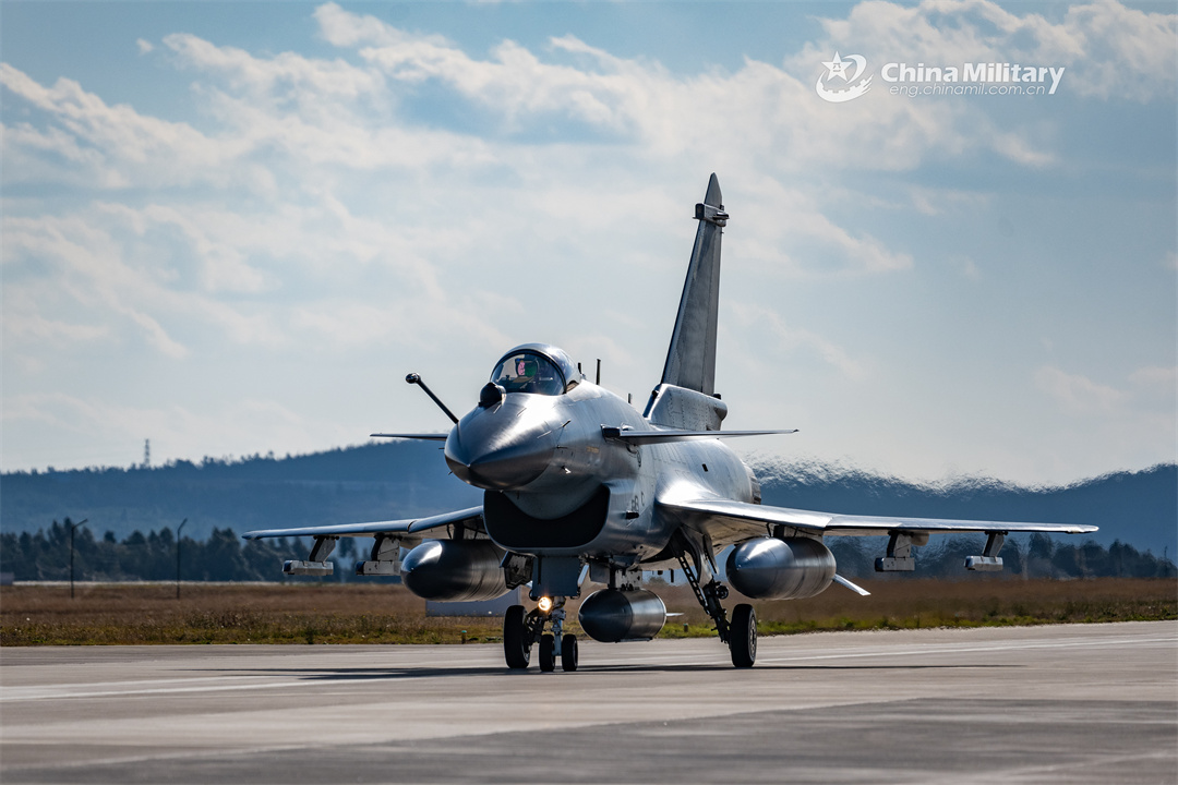 A J-10 fighter jet attached to an aviation brigade with the air force under PLA Southern Theater Command taxies on the runway during a flight training exercise on December 25, 2023. (eng.chinamil.com.cn/Photo by Shang Jieyan)