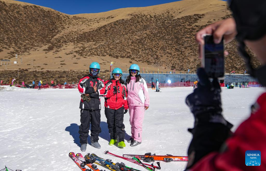 Skiing fans pose for a photo at the first ski resort of Xizang in Lhalung Village, Maizhokunggar County, southwest China's Xizang Autonomous Region, Jan. 13, 2024. The vast land of southwest China's Xizang Autonomous Region celebrated the opening of its first ski resort this snow season, with the resort established at an elevation of 4,500 meters just 120 km away from the Lhasa city center. (Xinhua/Jigme Dorje)