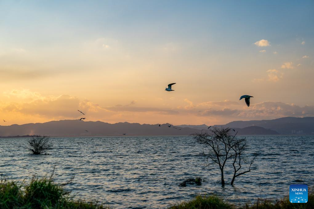 This photo taken on Jan. 13, 2024 shows a view of the Dianchi Lake in Kunming, southwest China's Yunnan Province. The overall water quality of Dianchi Lake has been maintained for six consecutive years since it reached Class IV in the country's five-tier evaluation system for the first time in 2018. (Xinhua/Hu Chao)