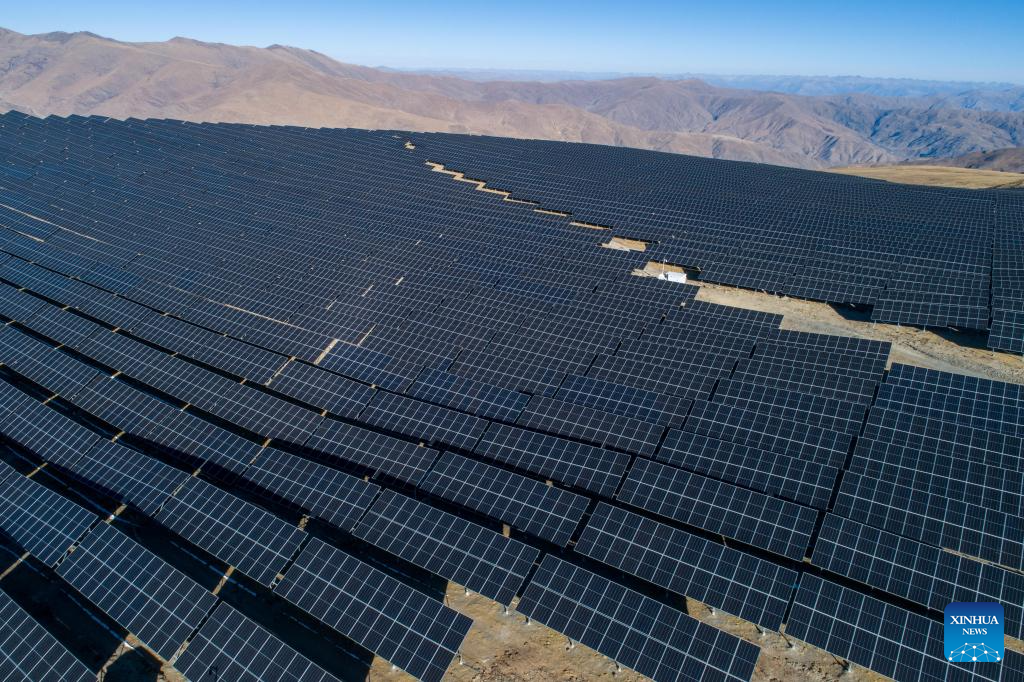 An aerial drone photo taken on Jan. 15, 2024 shows part of Cerbong photovoltaic power station in Shannan City, southwest China's Xizang Autonomous Region. Located in Nedong district of Shannan City on the Qinghai-Tibet Plateau, Cerbong photovoltaic power station is currently the highest-altitude of its kind in the world. The project started to upload electricity to the power grid on Dec. 30, 2023. (Xinhua/Tenzing Nima Qadhup)