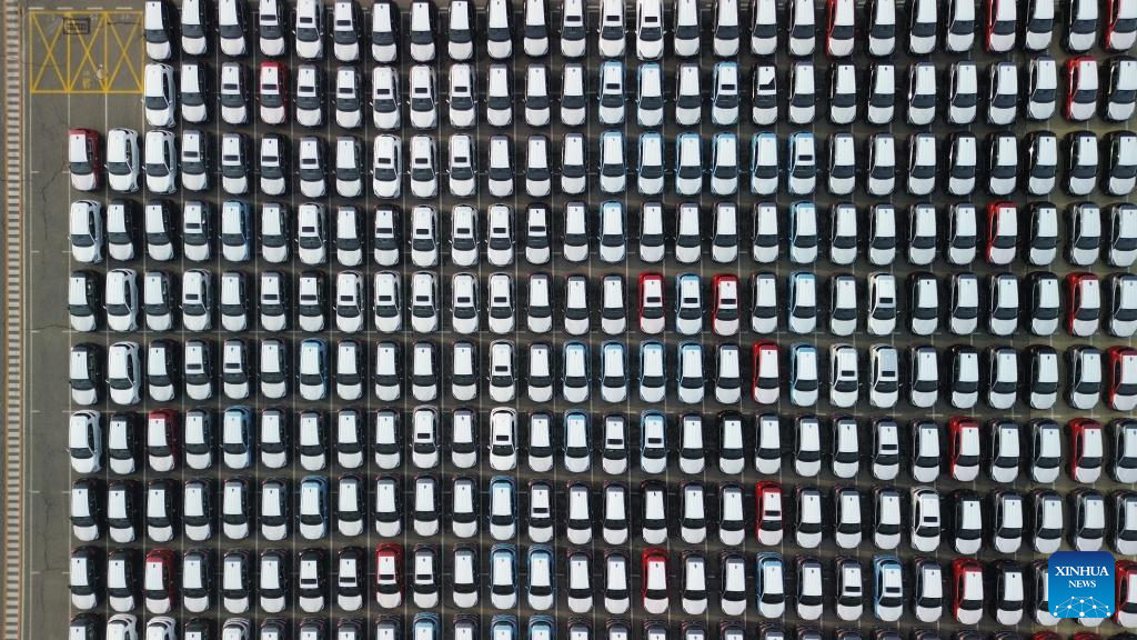 An aerial drone photo taken on Jan. 16, 2024 shows vehicles at a terminal of Dalian Port, northeast China's Liaoning Province. Dalian Port achieved a record-breaking annual export of 102,773 vehicles in 2023, marking a year-on-year growth of 143 percent, according to the Dalian Customs. (Xinhua/Chen Wei)