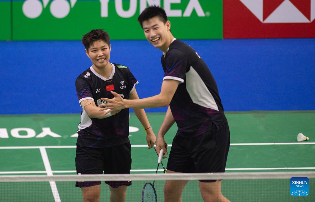 Huang Dong Ping (L) and Feng Yan Zhe of China celebrate during the mixed doubles match against Dejan Ferdinansyah and Gloria Emanuelle Widjaja of Indonesia at the India Open 2024 badminton tournament in New Delhi, India, Jan. 16, 2024. (Xinhua/Javed Dar)