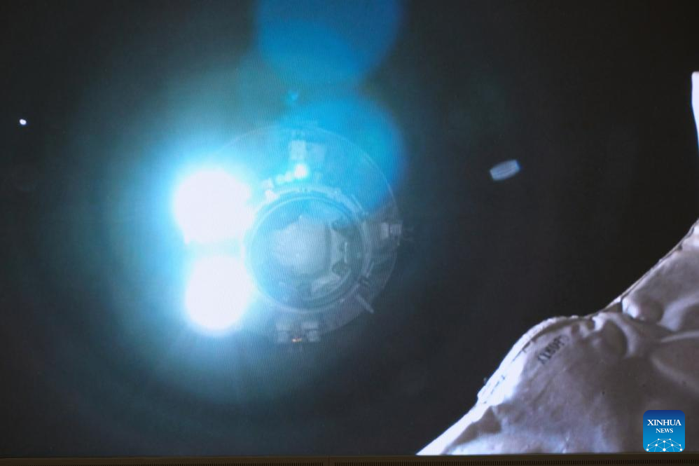 This screen image captured at Beijing Aerospace Control Center on Jan. 18, 2024 shows China's cargo spacecraft Tianzhou-7 docking with the combination of the space station Tiangong. (Photo by Han Qiyang/Xinhua)
