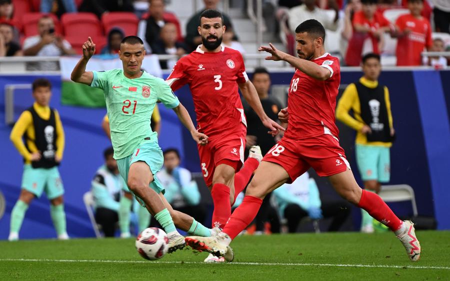 Liu Yang (R) of China vies with Ali Tneich of Lebanon during the Group A match between China and Lebanon at AFC Asian Cup Qatar 2023 in Doha, Qatar, Jan. 17, 2024. (Xinhua/Jiang Han)