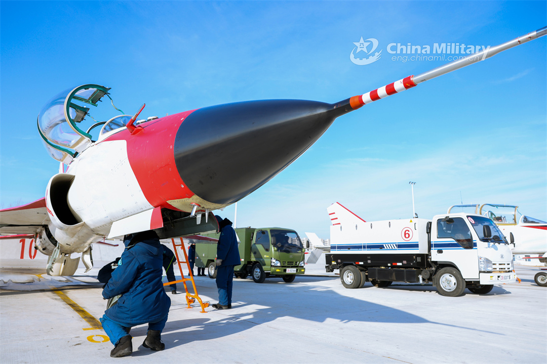 Maintenance men assigned to a regiment of the PLA Naval Aviation University conduct pre-flight inspections on a jet trainer during a flight training exercise in early January, 2024. (eng.chinamil.com.cn/Photo by Lan Pengfei, Lu Xinqian and Xu Kangyu)