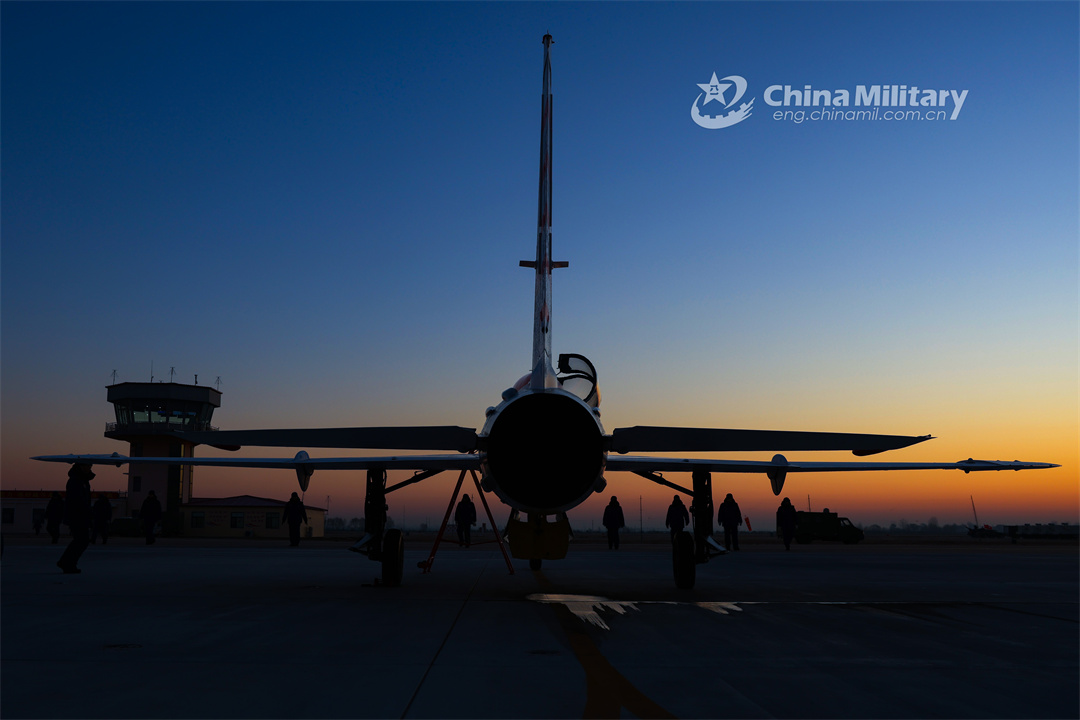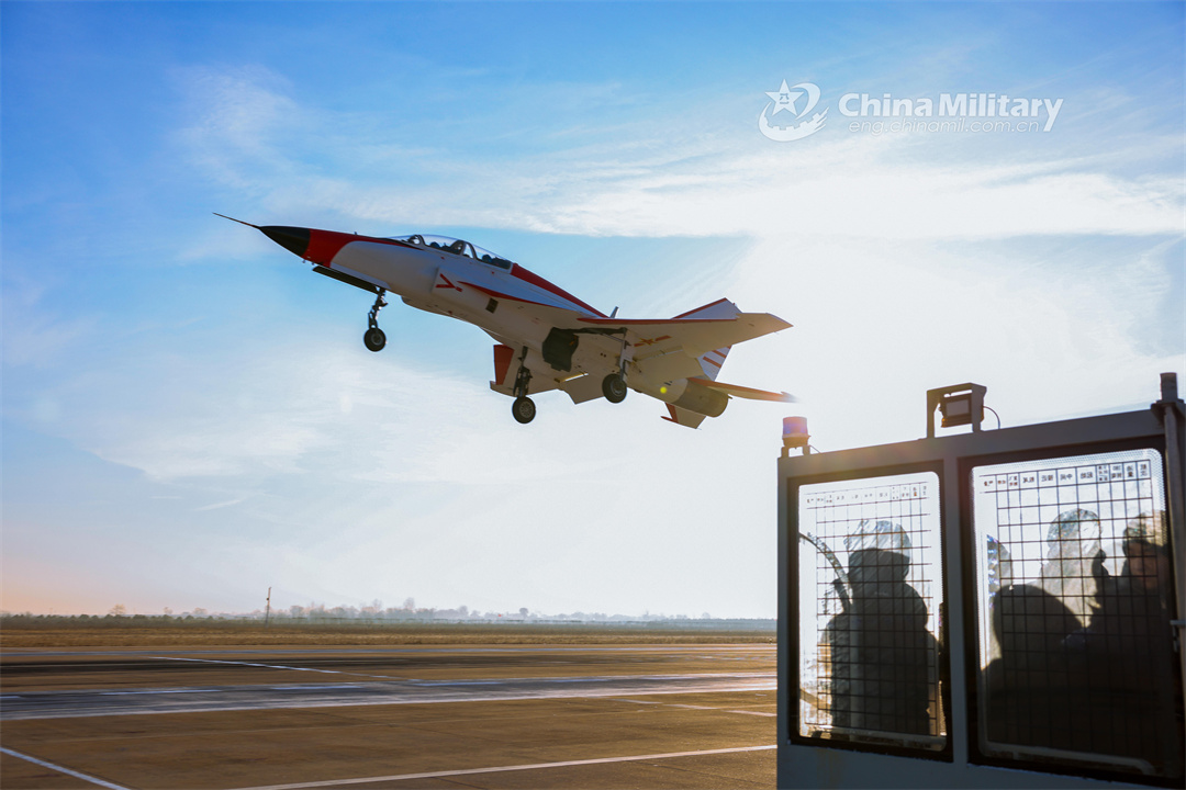 A jet trainer attached to a regiment of the PLA Naval Aviation University takes off for a flight training exercise in early January, 2024. (eng.chinamil.com.cn/Photo by Lan Pengfei, Lu Xinqian and Xu Kangyu)